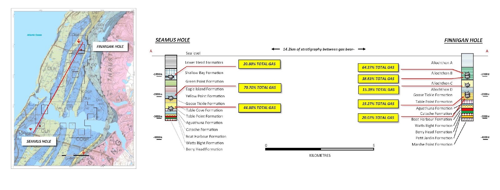 (Ref NALCOR ENERGY – OIL AND GAS INC FINAL HOLE REPORT For Nalcor Energy et al SEAMUS #1 https://www.gov.nl.ca/em/files/publications-energy-nalcorseamusfwr.pdf and NALCOR ENERGY – OIL AND GAS INC FINAL HOLE REPORT For Nalcor Energy et al Finnegan #1 https://www.gov.nl.ca/em/files/FinniganFWR.pdf ).